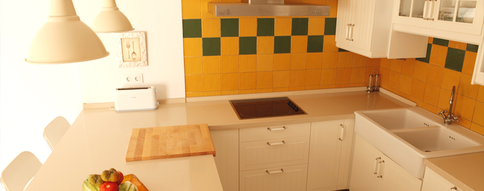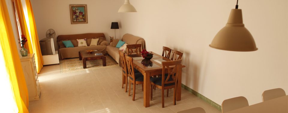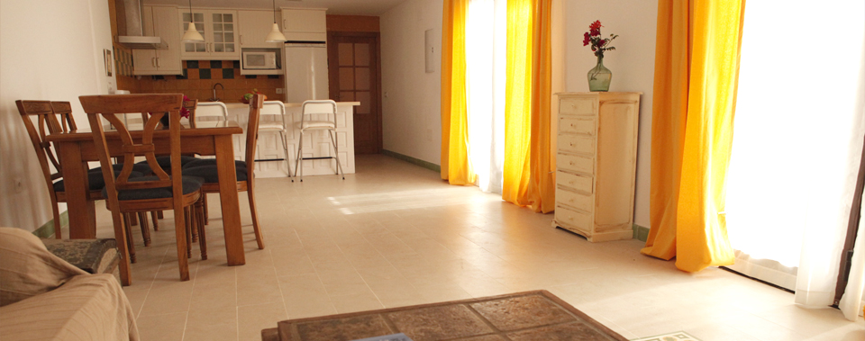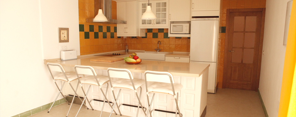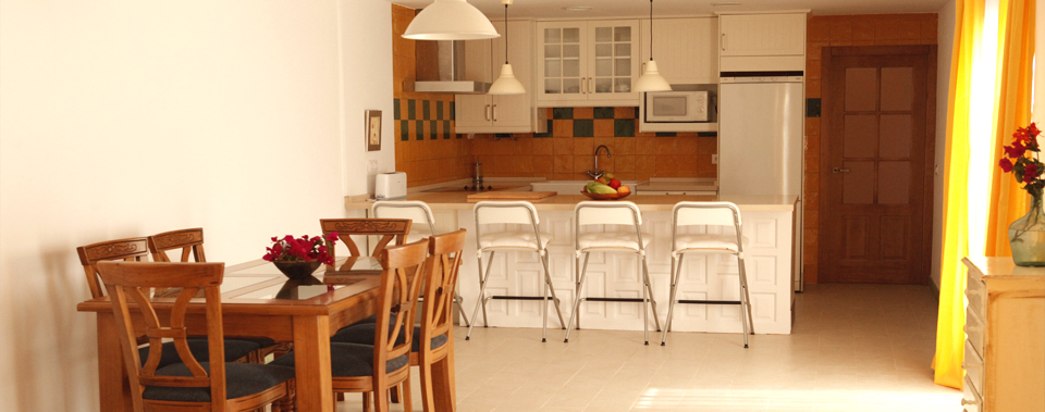 Salón de 46 metros con cocina americana y vistas a la Breña. Mesa grande para 6 comensales y cocina completamente equipada. Amplia encimera con taburetes, ideal para acompañar al o la cocinera. El conjunto es muy amplio y confortable.
